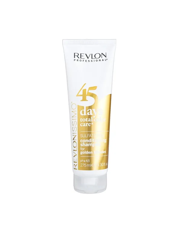 El champú acondicionador Revlon Professional 45 Days Total Color Care para rubios dorados es un champú especialmente formulado para preservar y realzar el color del cabello rubio, en particular de aquellos con tonos dorados. Este champú forma parte de la gama 45 Days Total Color Care, cuyo objetivo es prolongar la vitalidad del cabello teñido a la vez que lo nutre y lo protege de los daños.