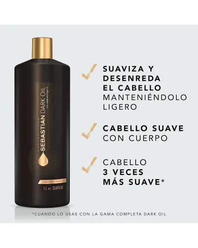 Acondicionador: Cabello brillante y voluptuoso. El acondicionador Dark Oil suaviza y ayuda a desenredar cualquier tipo de cabello. Proporciona un brillo absoluto a la que vez que ofrece cuerpo y volumen al cabello.