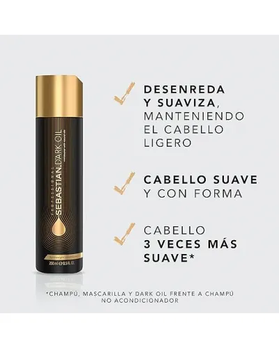 Cabello brillante y voluptuoso. El acondicionador Dark Oil suaviza y ayuda a desenredar cualquier tipo de cabello. Proporciona un brillo absoluto a la que vez que ofrece cuerpo y volumen al cabello.