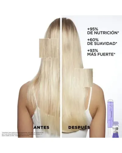Una fórmula restauradora y reductora de reflejos que permite iluminar instantáneamente el cabello rubio.