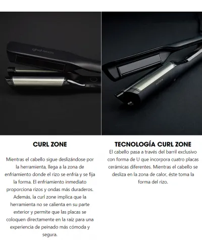 Incorpora la innovadora tecnología CURL-ZONE que combina una forma exclusiva en U, la potencia de moldeado del calor y las ventajas del frío para fijar el peinado para crear rizos u ondas de gran durabilidad en cualquier tipo de cabello DE UNA SOLA PASADA.
