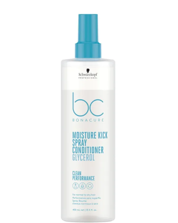 Spray acondicionador sin aclarado de Bonacure Moisture Kick, especialmente formulado para acondicionar al instante e hidratar el cabello de normal a seco, texturizado, quebradizo o rizado.
