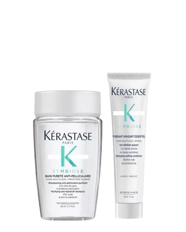 El champú Bain Pureté Anti-Pelliculaire de la gama Symbiose de Kérastase es un champú anticaspa purificador y calmante para cueros cabelludos grasos y sensibles propensos a la caspa. El champú exfolia la caspa y las escamas visibles del cuero cabelludo al instante. Limpia en profundidad los poros del cuero cabelludo obstruidos por las células muertas y la acumulación de sebo, aliviándolo y reduciendo el picor. Se respeta la fibra y se elimina la caspa.