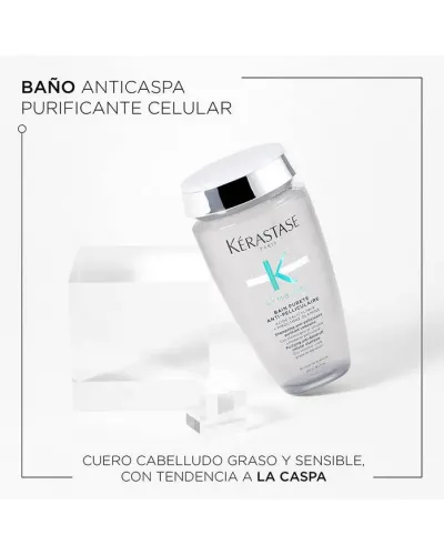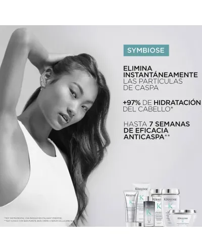 El champú Bain Pureté Anti-Pelliculaire de la gama Symbiose de Kérastase es un champú anticaspa purificador y calmante para cueros cabelludos grasos y sensibles propensos a la caspa. El champú exfolia la caspa y las escamas visibles del cuero cabelludo al instante. Limpia en profundidad los poros del cuero cabelludo obstruidos por las células muertas y la acumulación de sebo, aliviándolo y reduciendo el picor. Se respeta la fibra y se elimina la caspa.