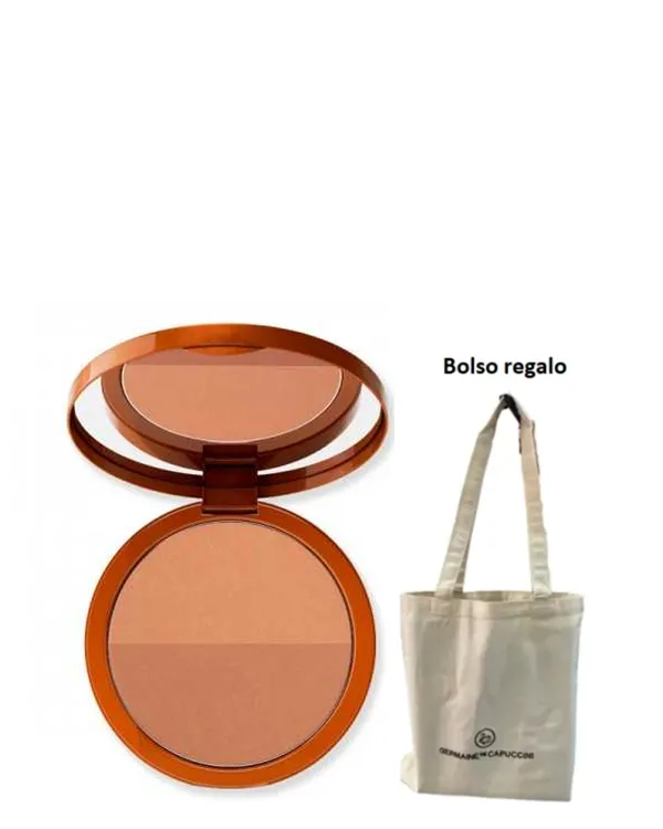Dúo de polvos bronceadores con efecto buena cara. Sus tonos vitaminados y pigmentos dorados iluminan y realzan la piel, mientras que su cobertura natural disimula imperfecciones y ofrece protección UVB.