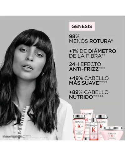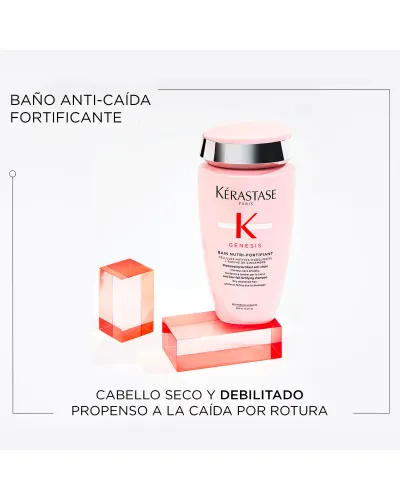 El Bain Nutri-Fortifiant de Kérastase, un champú fortalecedor anti-caída y anti-rotura para cabello seco. Descubre la nueva gama de cuidado GENESIS, un tratamiento completo con doble acción anti-caida para cabello debilitado y propenso a la caída. Protege en el cuero cabelludo las raíces debilitadas por factores internos como estrés, desajustes hormonales o dietas, mientras previene la rotura de la fibra en medios y puntas debido a factores externos como el cepillado, las herramientas de calor o la polución. Este champú para cabello seco elimina impurezas mientras nutre y fortalece el cabello. Con una tecnología patentada, proporciona nutrición intensa, facilita el desenredado y aporta sensación de ligereza.